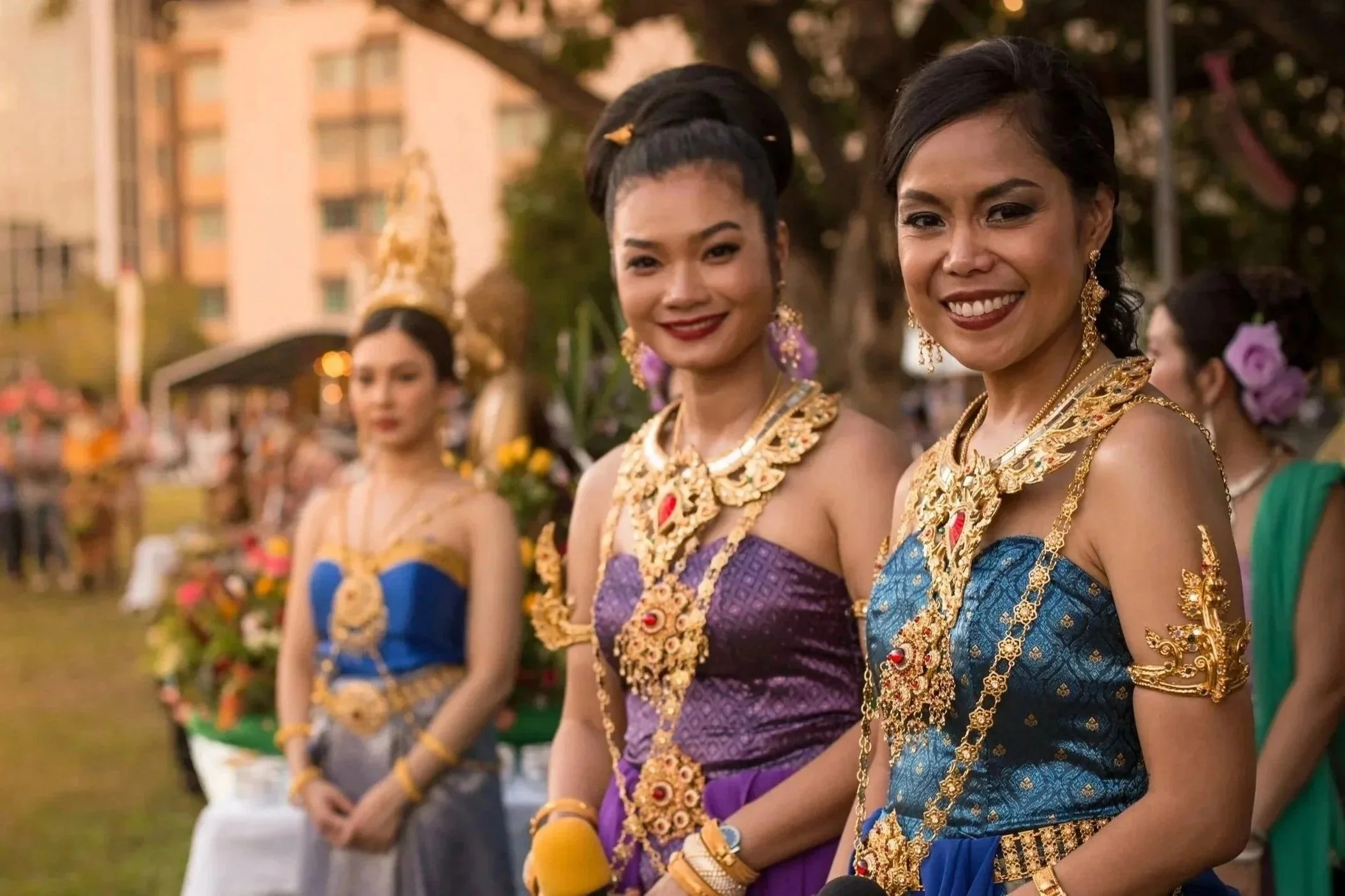• Two women at an outdoor event during sunset, both holding drinks and smiling, with others in the background.  They are at the Bass in the Grass Festival in Darwin in the Northern Territory.